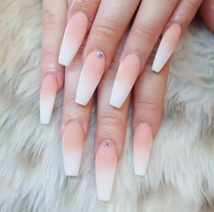 Cute pink and white ombre coffin nails with foil & glitter ombre accent nail design!